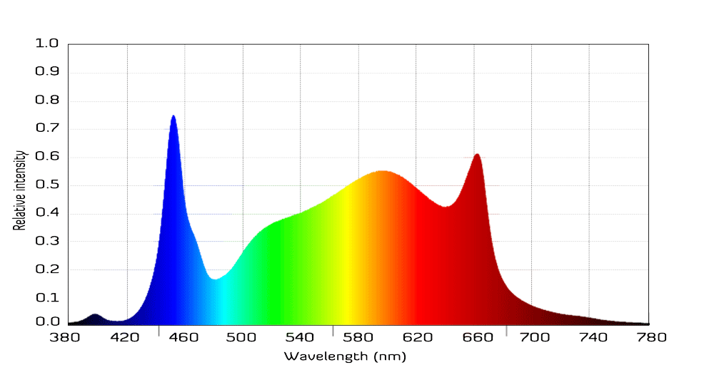 Full Spectrum with UV and IR included plus Samsung white led diodes and Epistar or Osram Red diodes, this light can produce the same amount of light output compared to a 1000W HPS lamp.
