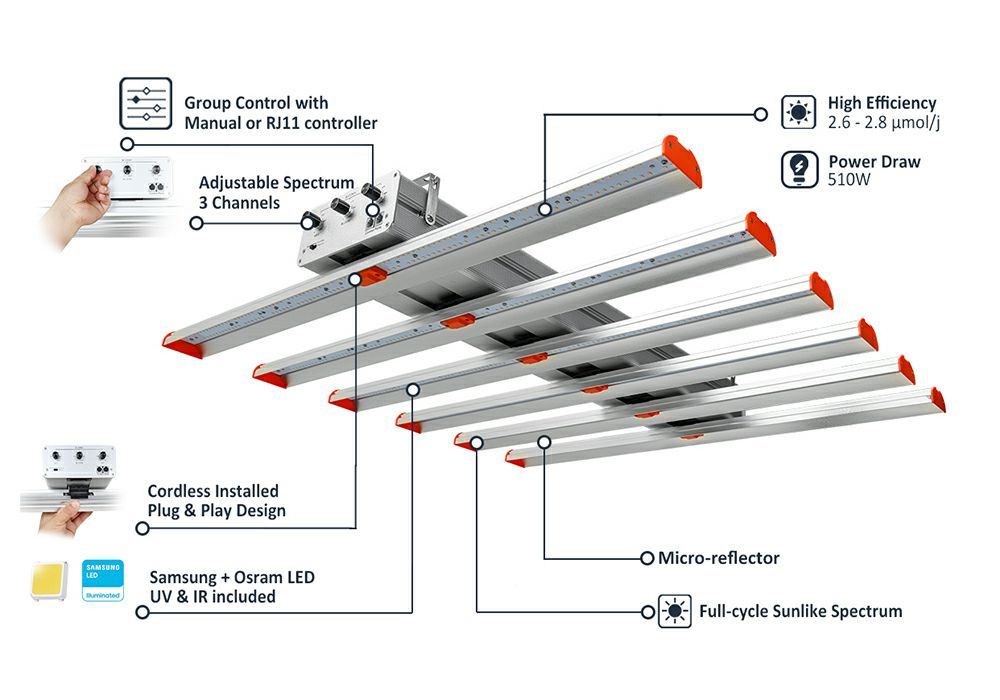 Sundro LED grow light fixtures incorporate Samsung 3000K + 5000K white diodes with 660nm Reds + 730nm IR + 395nm UV to produce a rich full spectrum delivers a superior quality light, driving increased levels of photosynthesis and promoting higher quality crops.
