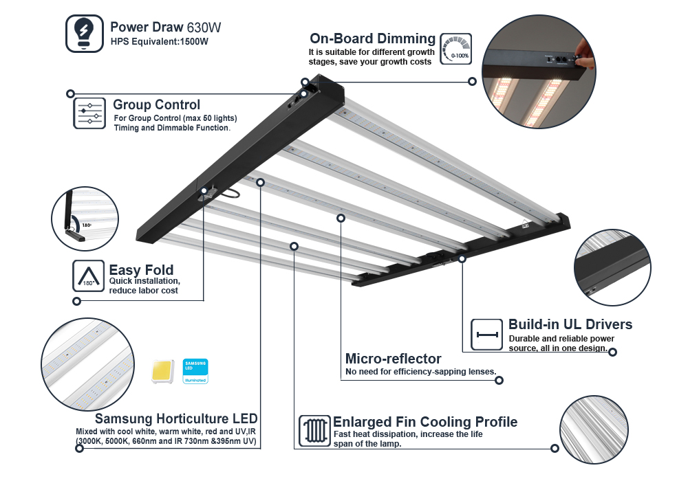 SunPAR LED Grow Light series is a full spectrum foldable LED grow light bar system, each bar is power draws 105W, two powerful options including SP800 (840W) and SP600 (630W) both specially designed for different growers' requirements. Special suitable for indoor cannabis growing! Grow with SunPAR grow bar light, your crop yield can be boosted by 30%.